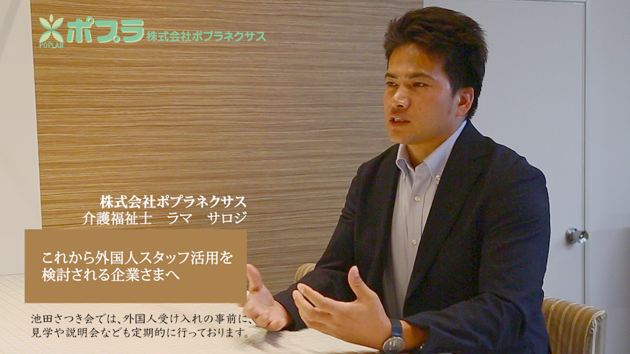 当社で働く、ネパール出身のラマ・サロジは、日本での勤続9年目を迎える介護福祉士です。現在は社会福祉法人いけださつき会から株式会社ポプラネクサスへ出向し、外国人人材担当として活躍しています。